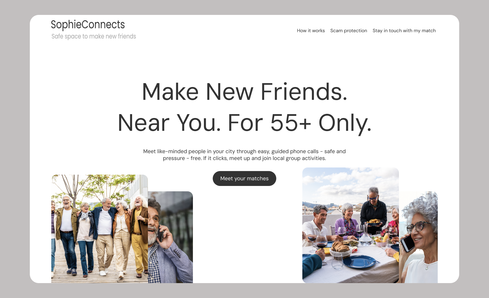 SophieConnects is a social platform for 50+ people. I made a UX/UI landing page, personal account and onboarding with paywall from scratch, independently implemented the layout, connected and configured Amplitude, completed the technical tasks (domain, deployment to Vercel), closing the full launch cycle